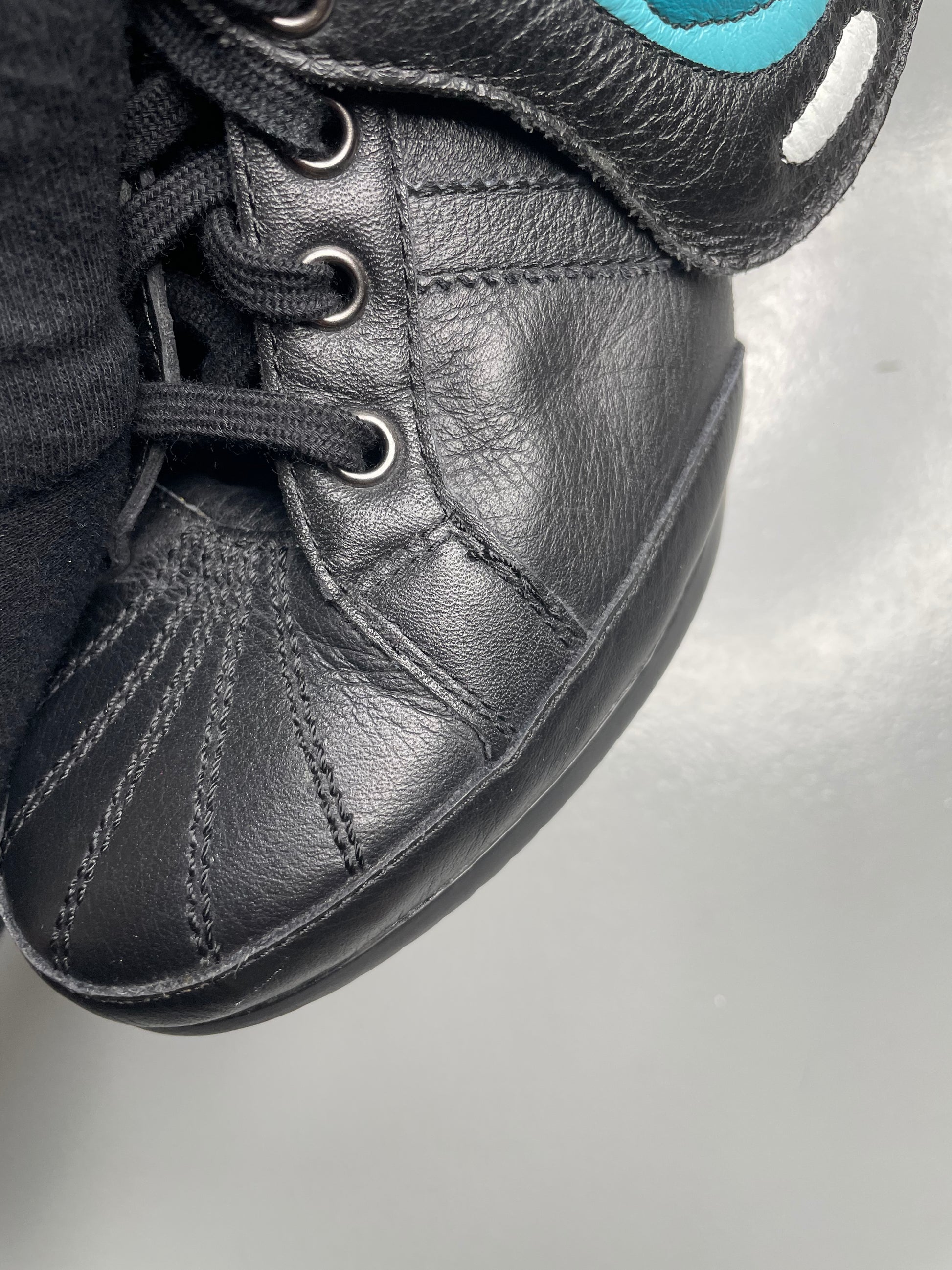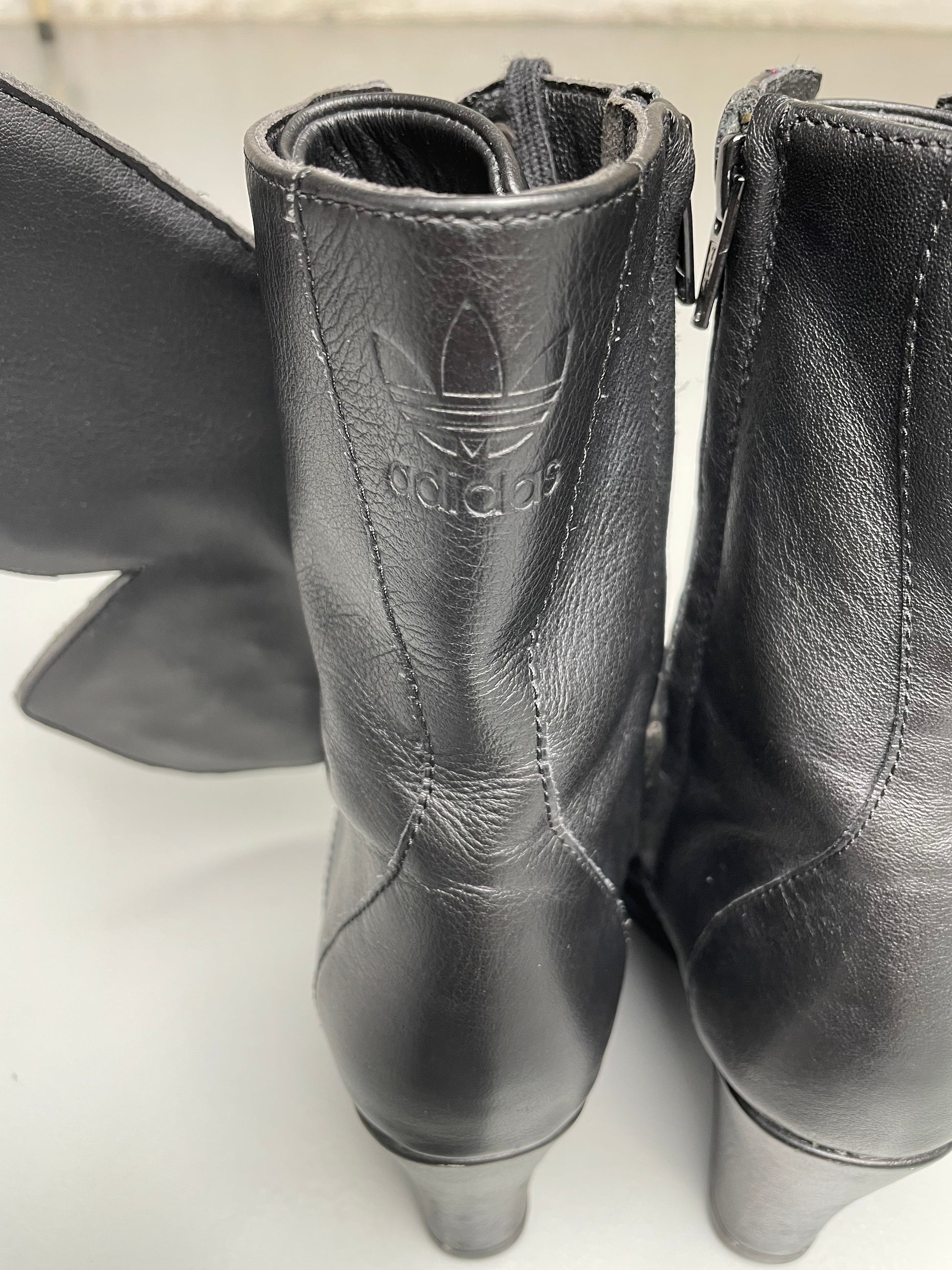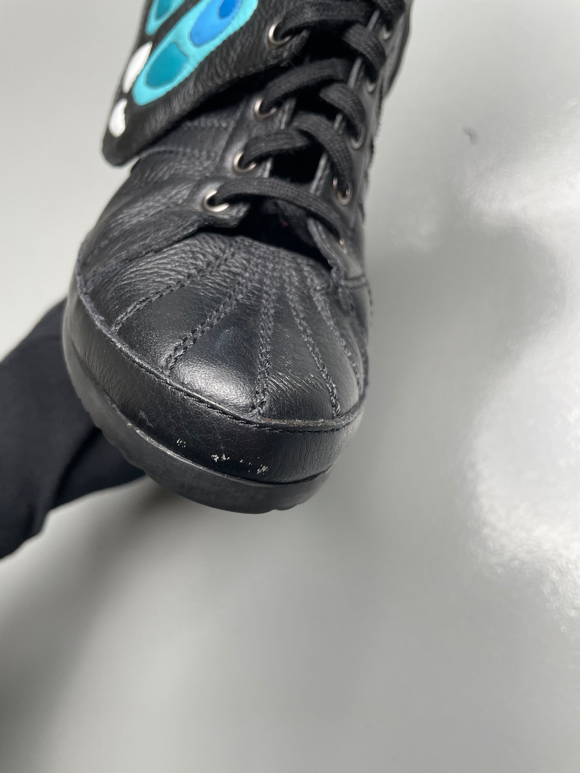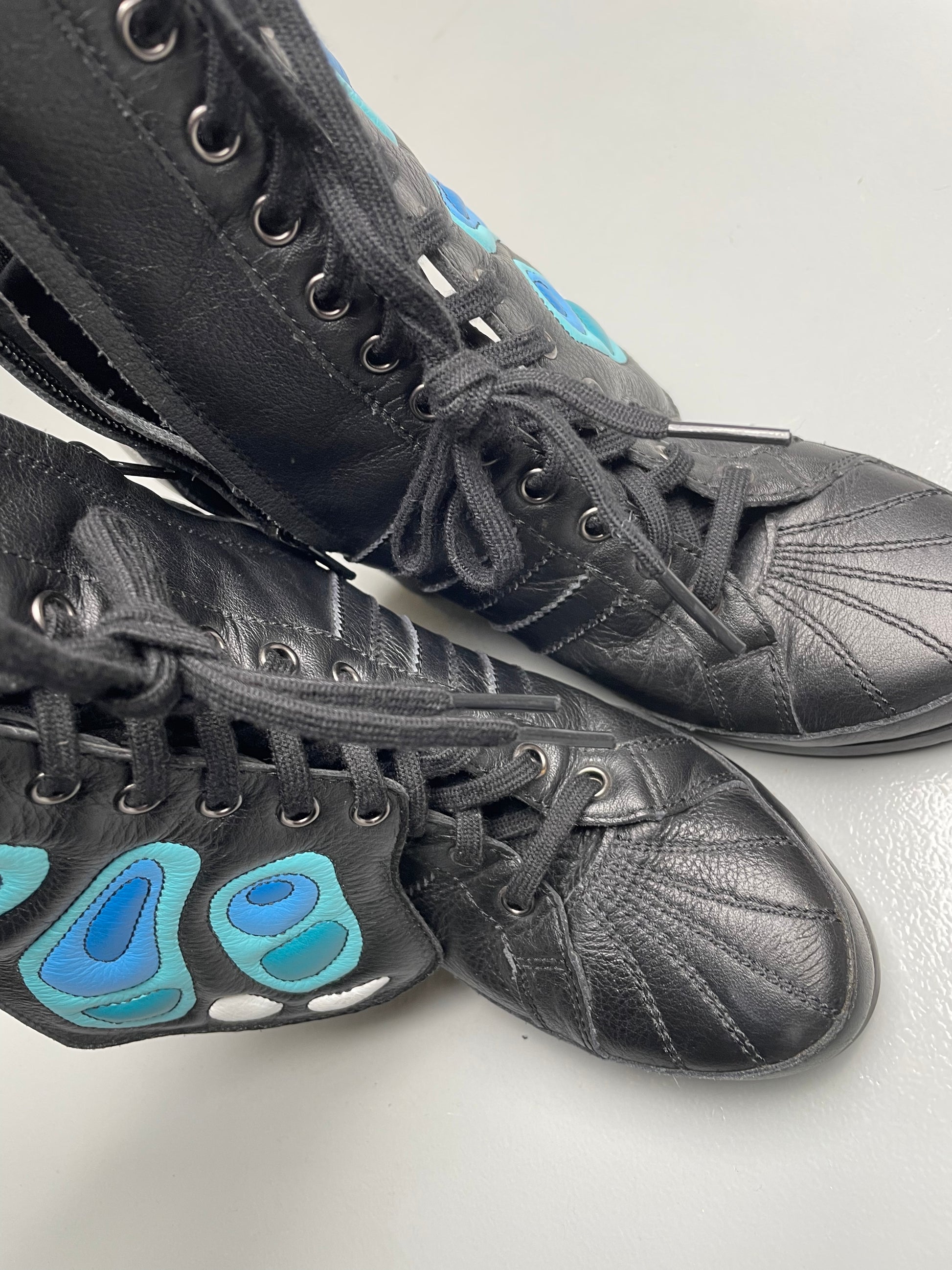 Part of the Fall Winter 2012 collection, the Butterfly Boots are the original JS Wings Wedge. Fully wrapped in black leather, they feature removable wings painted in the vibrant colors of an exotic butterfly. Exceptionally rare and instantly iconic, they stand as one of the most extraordinary women’s shoes ever released by adidas.