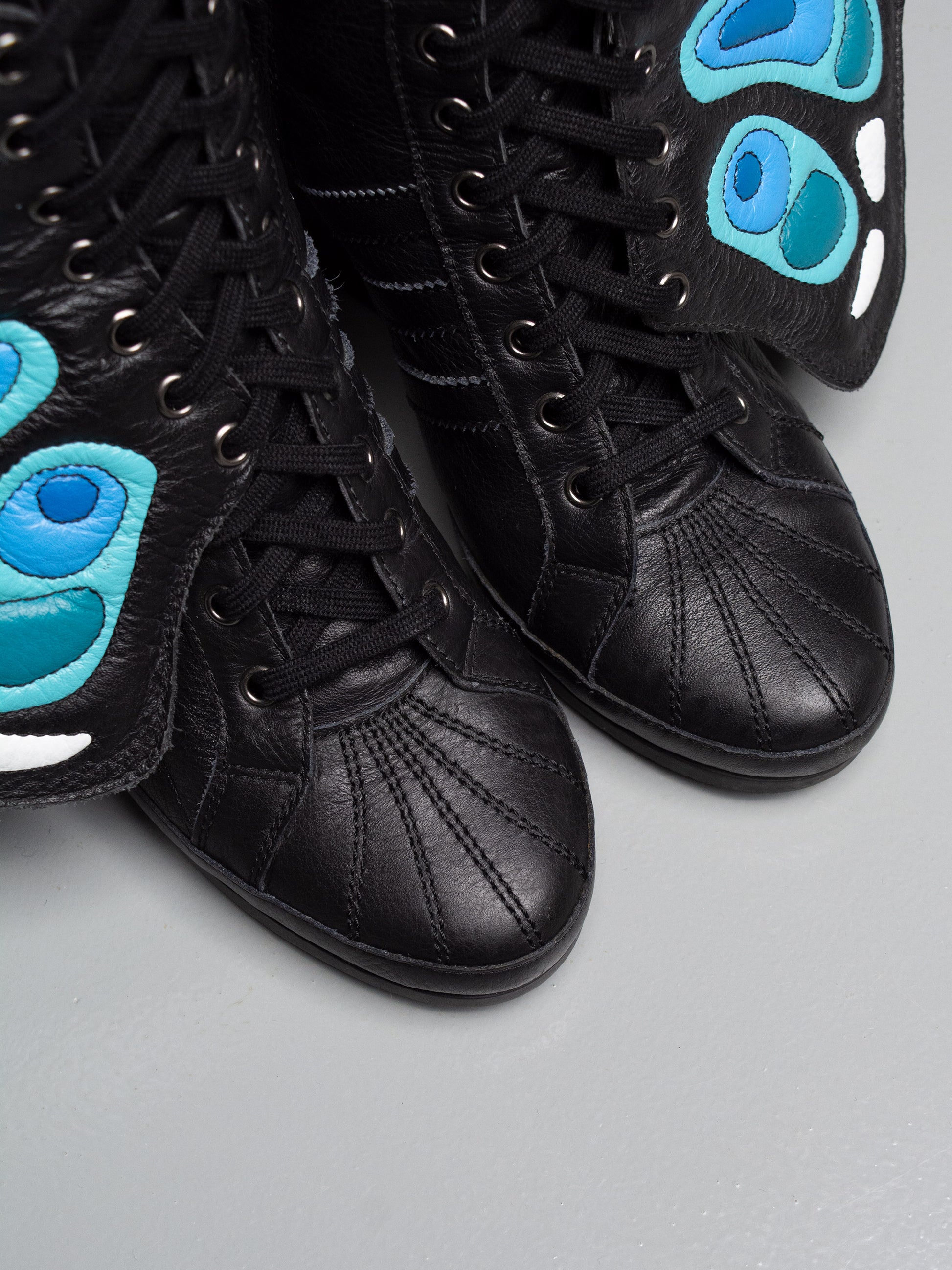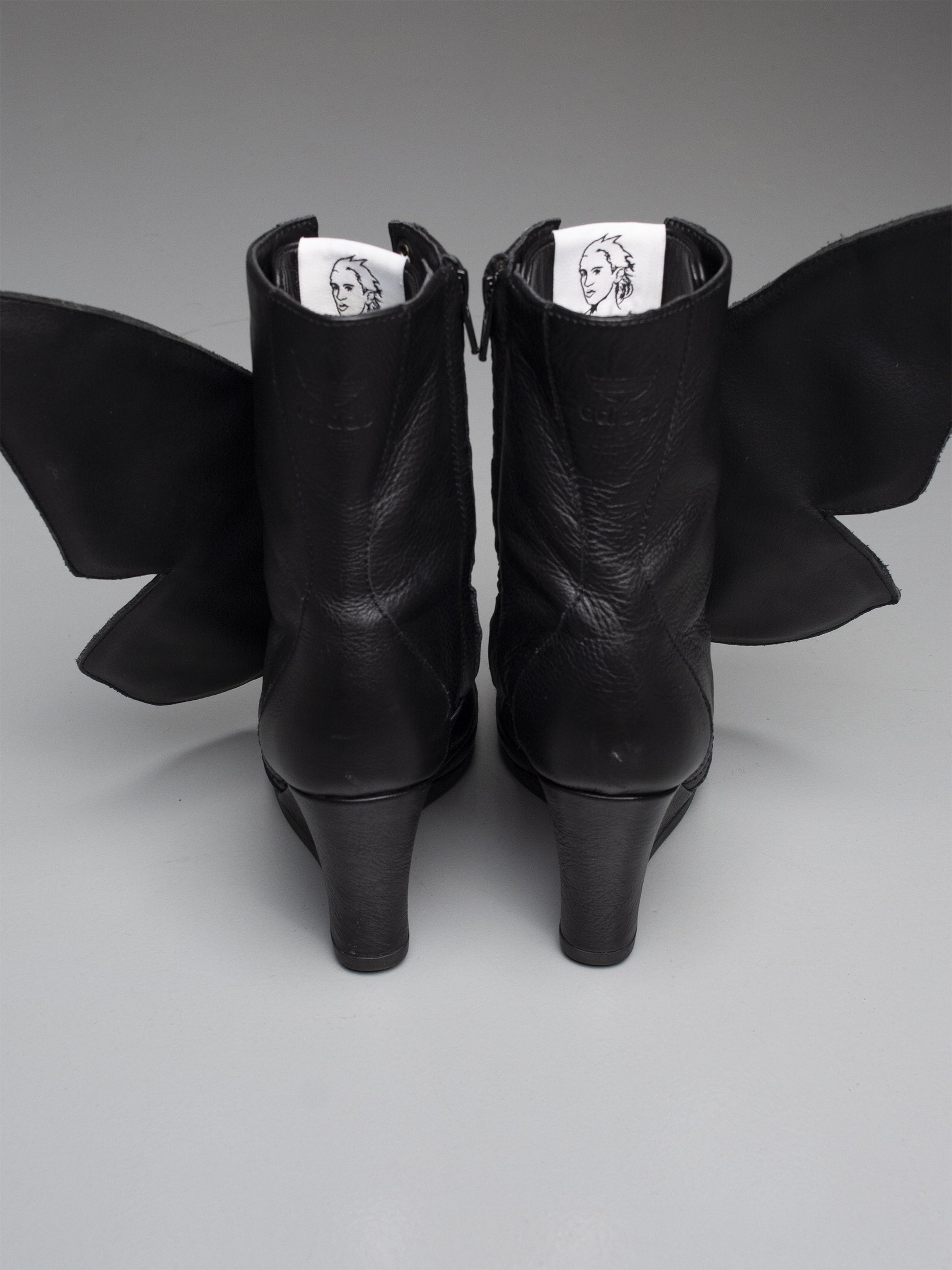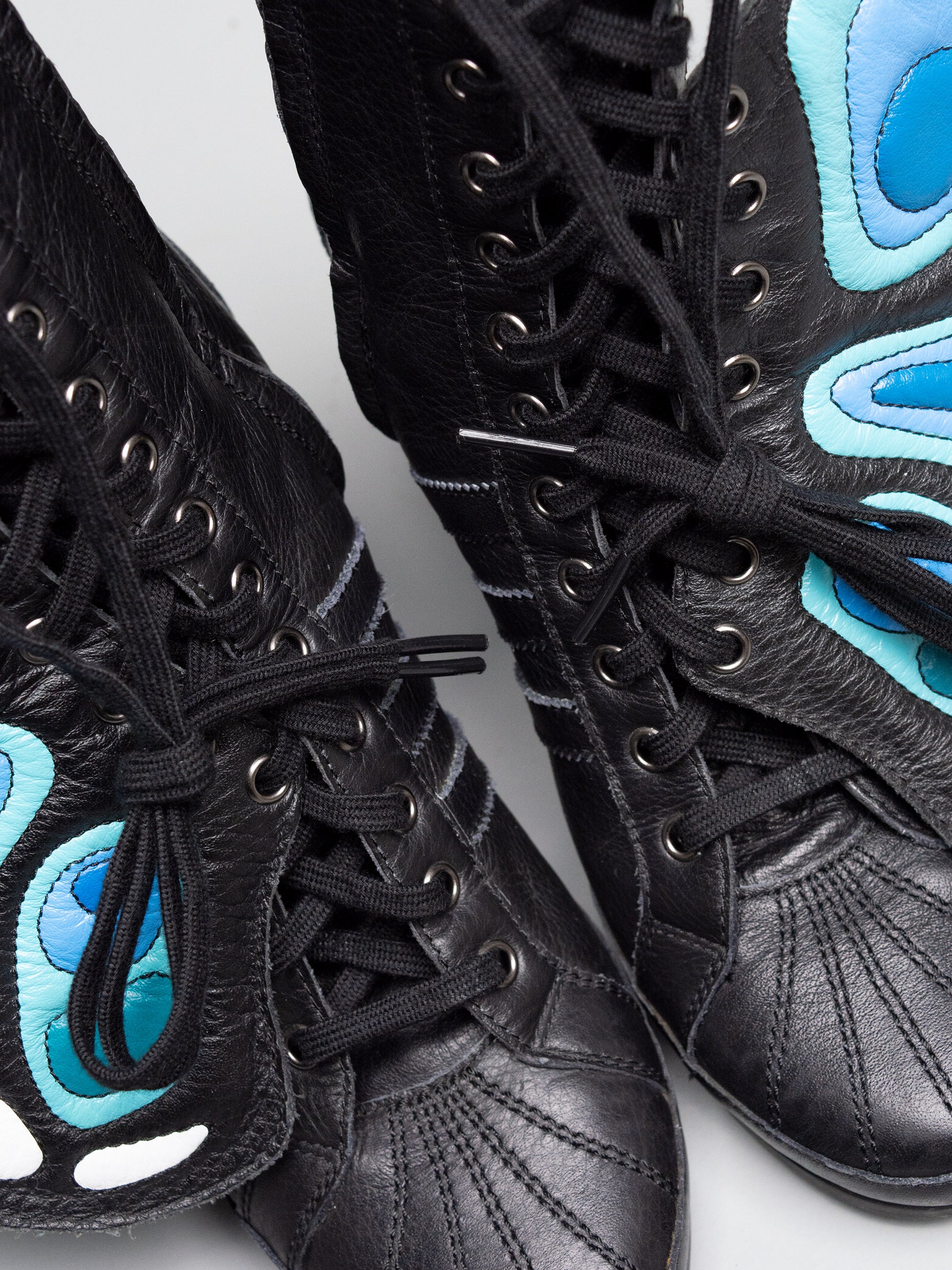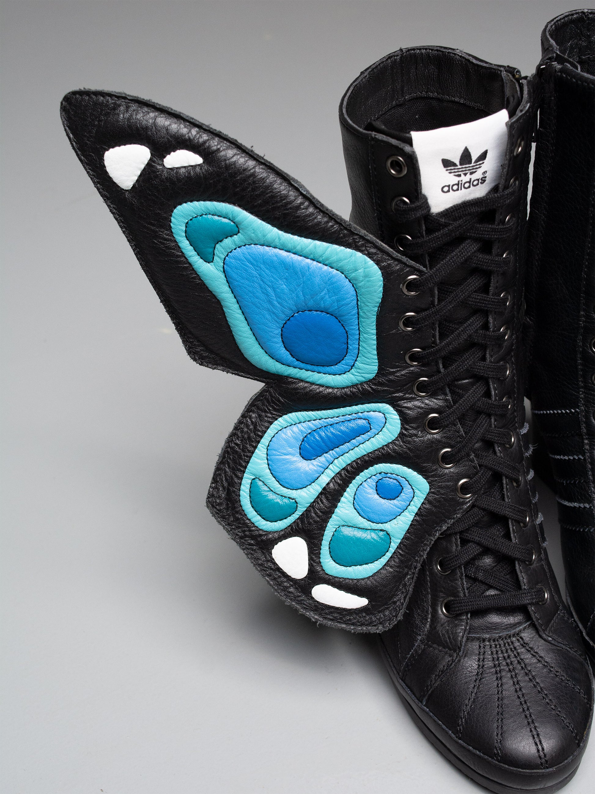 Part of the Fall Winter 2012 collection, the Butterfly Boots are the original JS Wings Wedge. Fully wrapped in black leather, they feature removable wings painted in the vibrant colors of an exotic butterfly. Exceptionally rare and instantly iconic, they stand as one of the most extraordinary women’s shoes ever released by adidas.