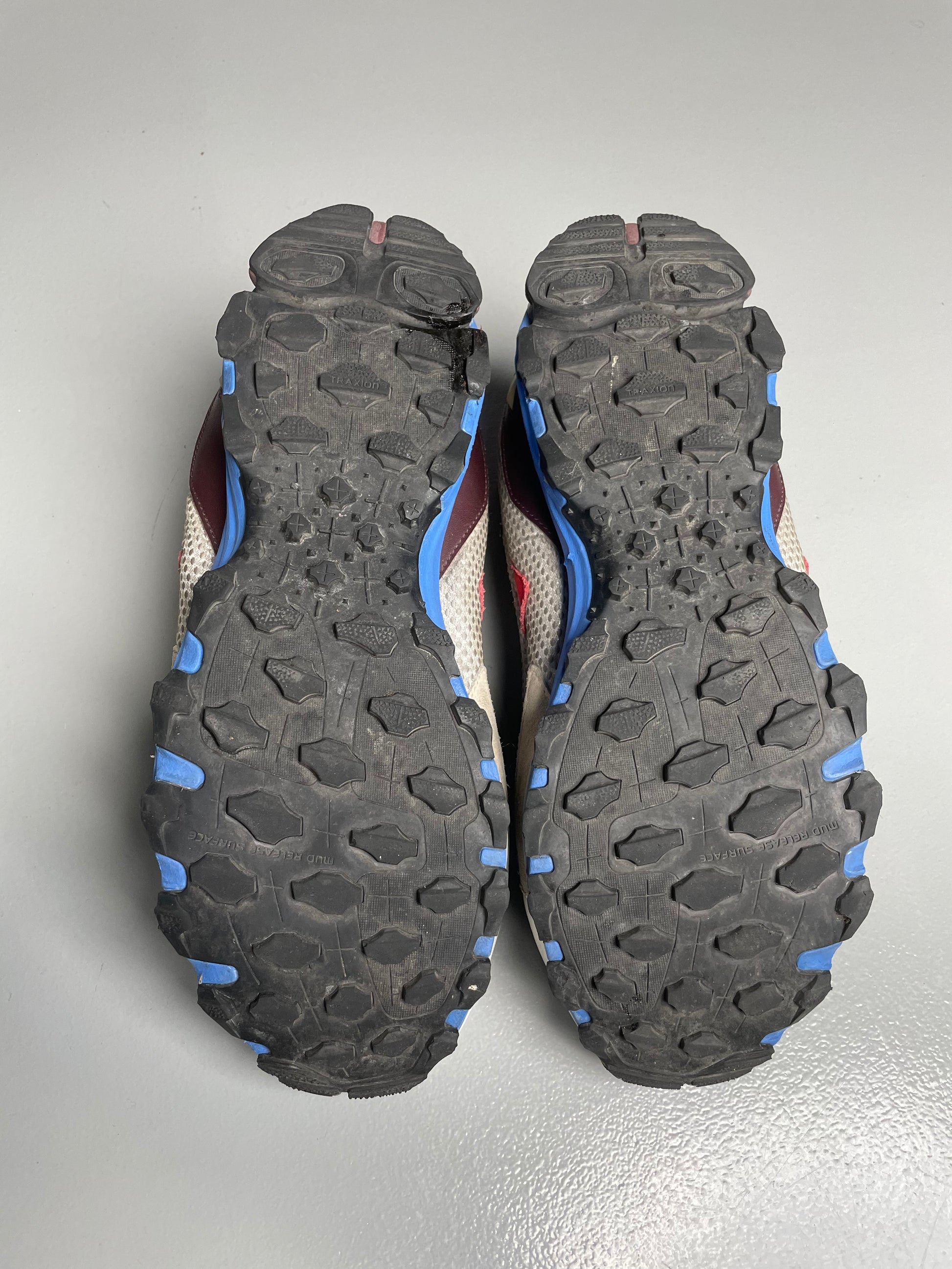 In good condition, one of the plastic accessories was reglued and can't be rotated anymore (see photo), the yellow one is also a bit bent, it's not a noticeable flaw. The overall condition is still much better than what is usually found online for these shoes. The shoes are a bit dirty from regular use.